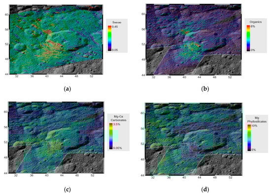 The mapped abundances of minerals have been reported by Raponi et al. [], who used the same spectral modeling discussed in Section 2.2, but considering only the IR channel. Thus, the S0.48–0.80µm and the mineral abundances came from two independent datasets.