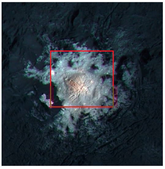 Image of Cerealia Facula obtained by combining framing camera images acquired during LAMO phase with three images using spectral filters centered at 438, 550, and 965 nm. VIR pixel footprints inside the red rectangle (lat: 19.25° N–20.0° N, lon: 239.25° E–240° E) were averaged to obtain the reflectance spectrum [].
