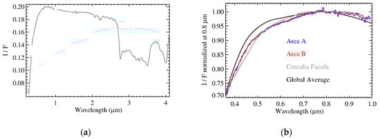 Panel (a): Cerealia Facula average I/F spectrum’s VIS and IR channels (gray) were merged to obtain a single spectrum. Spectral range longward of 4.1 µm (not shown here) is affected by a high noise level after the subtraction of the thermal emission. Panel (b): focus on the visible spectral range; the spectrum of Cerealia Facula, the global Ceres spectrum, and the organic rich regions (Area A and B) were normalized at 0.8 µm.