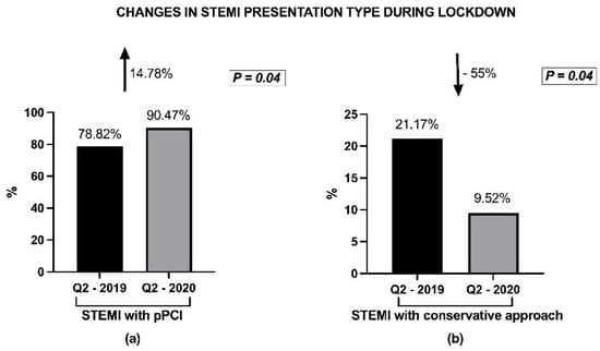 Interestingly, in the STEMI group there was a 14.7% increase in the proportion of patients who presented to hospital in time for pPCI (within the recommended time interval of 12 h after the onset of symptoms) during the lockdown period. Therefore, pPCI was possible in 90.47% of STEMI cases during Q2 of 2020, as compared to only 78.82% reported during Q2 of 2019 (p = 0.04) (Figure 2). However, this was not related to an absolute increase in the number of timely presentations for STEMI, but rather to a significant reduction of 55% in the absolute number of late STEMI presentations (after the first 12 h after the onset of symptoms) in Q2-2020, since during lockdown patients who stayed home more than 12 h were more likely to continue to stay home instead of going to ER, from the fear of the virus.