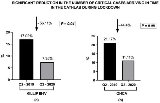 However, at the level of the network we recorded a lower number of critical cases transferred to the interventional center, with a dramatic reduction of 56.1% in the number of critical STEMI cases arriving in the acute cardiac care unit in Q2-2020 compared to Q2-2019. The proportion of STEMI cases with KILLIP class III or IV decreased from 17.0% in Q2-2019 to 7.3% in Q2-2020 (p = 0.04), while hospital admission for cardiac arrest complicating STEMI decreased from 21.17% in Q2-2019 to 11.11% in Q2-2020 (a 44.4% reduction, p = 0.08) (Figure 3).