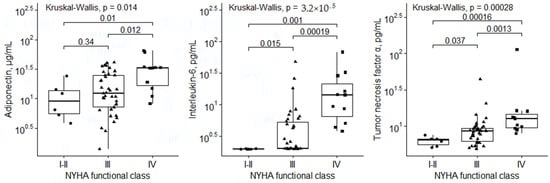 Data analysis was performed using the R studio package (4.0.3 version). A p-value of <0.05 was considered statistically significant. Continuous variables are expressed as the median (25th percentile, 75th percentile) and categorical data as counts and percentages. The Mann–Whitney U test compared continuous variables between two groups, Kruskal-Wallis test—between three groups. Categorical variables were compared between the groups by the chi-square test or Fisher’s exact test if expected values were <5. The association between inflammation-related and heart failure severity parameters was assessed using the Spearman correlation.