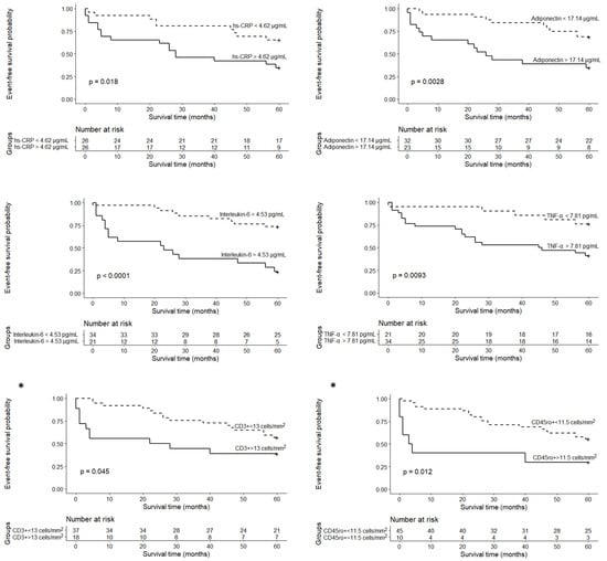 Kaplan–Meier survival analyses with log-rank tests were subsequently performed to reveal alterations in survival probability among patient groups based on the obtained cut-off values (Figure 2). Higher levels of inflammation-related markers (hs-CRP > 4.6 µg/mL, IL-6 > 4.53 pg/mL, TNF-α > 7.81 pg/mL, adiponectin > 17.14 μg/mL) and higher numbers of infiltrative inflammatory cells (CD3+ > 13 cells/mm2 and CD45ro+ > 11.5 cells/mm2) were associated with lower survival rates (Figure 2). No significant differences in survival probability were obtained for the other inflammation-related biomarkers.