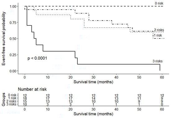 As all three cytokines that were measured predicted adverse cardiac events with the highest accuracy (Table S1), they were subjected to further analysis. Figure 3 shows a risk stratification based on the three cytokines. All patients (n = 12) with IL-6 < 4.53 pg/mL, adiponectin < 17.14 μg/mL and TNF < 7.81 pg/mL had a 100% five-year event-free survival, whereas all patients (n = 10) with concentrations of these three cytokines above the cut-off values experienced adverse cardiac events. Patients with one or two cytokines above the cut-off value had a similar five-year survival: 50% and 40% event-free survival rate, respectively.