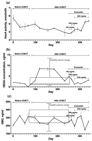 (a) Dynamic changes in the HexA activity in the TSD patient’s plasma after UCBCT and curcumin administration; normal level of HexA activity observed in healthy donors is 24–148 nmol/mL/h; (b) Dynamic changes in the HexA concentration in the TSD patient’s serum after UCBCT and curcumin administration. The HexA concentration range measured in a cohort of healthy donors (n = 10) is shown in gray; (c) Dynamic changes in the GM2 level in the TSD patient’s plasma after UCBCT and curcumin administration. The GM2 level range measured in a cohort of healthy donors (n = 10) is shown in gray. The patient took curcumin for 3 months as follows: 500 mg/day for 10 days, 1000 mg/day for 10 days and then 3500 mg/day for 100 days. The graph represents the mean and standard deviation of three technical replicates of each patient point and the mean and standard deviation of one technical replicate of ten healthy donors (ten biological replicates). Statistical analysis was achieved using GraphPad Prism 7 software (GraphPad Software), with one-way ANOVA followed by Tukey’s HSD post hoc comparison test.