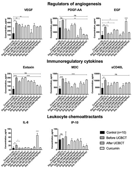 The levels of cytokines in the serum of healthy donors and the patient over time were determined. The level of each analyte was compared before and after transplantation, before and after long-term use of curcumin and with the results of the control group. It was shown that before UCBCT and curcumin administration, the levels of VEGF, EGF, eotaxin-1, MDC, sCD40L and IL-8 in the patient’s serum were significantly higher compared to the control group of healthy donors (n = 10). VEGF level was 2.8 times higher (387.5 ± 29.8 pg/mL), EGF (345.4 ± 0.8 pg/mL) was 3.09 times higher, eotaxin-1 (200.6 ± 1.9 pg/mL) was 3.1 times higher, MDC (1127.9 ± 5.7 pg/mL) was 2.7 times higher, sCD40L (10260.3 ± 793.1 pg/mL) was 2.2 times higher and IL-8 (21.3 ± 1.3 pg/mL) was 2.7 times higher in comparison with healthy donors (VEGF (138.2 ± 133.7 pg/mL), EGF (111.6 ± 103.4 pg/mL), eotaxin-1 (64.8 ± 28.7 pg/mL), MDC (413.3 ± 175.8 pg/mL), sCD40L (4576.1 ± 3168.7 pg/mL), IL-8 (7.8 ± 6.0 pg/mL)) (Figure 2, Table S1).