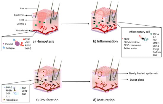 The major stages during the process of wound healing: (a) hemostasis; (b) inflammation; (c) proliferation; (d) maturation.