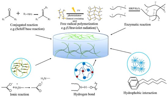 At present, most of the hydrogel materials are prepared by chemical cross-linking. Chemically cross-linked hydrogels often have good mechanical properties and stronger stability [54]. They are dominated by the conjugation reaction, free radical polymerization reaction, and the enzymatic reaction.