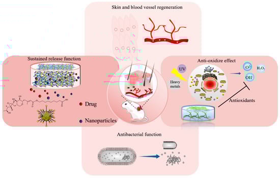 The skin is the main external defense system, which protects the body from microbial invasion and the influence of the external environment. Therefore, skin damage can pose a serious threat to human health [12]. The skin is composed of three tissue layers: the epidermis, dermis, and hypodermis [21]. The most important function of the epidermis is to form the external barrier of the body, as well as having absorption and immune functions. The dermis contains fibroblasts, mast cells, lymphocytes, and so on. Fibroblasts can produce collagen fibers, elastic fibers, reticular fibers, and matrices. At the same time, it is the main tissue repair cell after the deep damage of skin tissue. The hypodermis has loose tissue and rich blood vessels, which have the functions of connecting, buffering mechanical pressure, storing energy, and maintaining heat preservation. Knowing the composition of normal skin is helpful to our understanding of wound healing. Globally, chronic wounds impose a significant burden on patients and healthcare systems. Chronic wounds are susceptible to bacterial invasion, which can form biofilms at the wound site and inhibit the proliferation of endothelial and epidermal cells. Serious cases can be life-threatening [22,23].