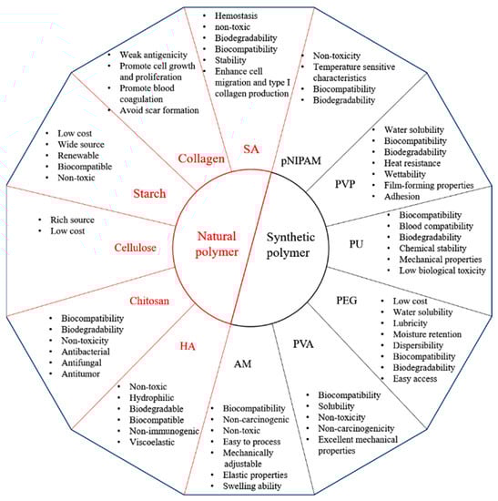 Biomaterials used in tissue engineering or regenerative medicine are generally divided into two categories: natural biomaterials and synthetic materials [72]. Regardless of the source of materials, hydrogel dressings should have low toxicity, good biocompatibility, and facilitate the growth of cells near the wound. In addition, synthetic hydrogel dressings should also have good mechanical properties, biodegradability, moisture retention, antibacterial, antioxidant, non-adhesion, and good air permeability, etc., [73] as shown in Figure 3. Recently, the hydrogel dressings synthesized by natural biomaterials have become the focus of research [74]. Natural biomaterials such as chitosan, collagen, starch, cellulose, sodium alginate, and hyaluronic acid are widely used in the synthesis of hydrogel wound dressings. However, there are some problems such as low mechanical properties, high acquisition cost, small output, and difficult modification. Synthetic materials have specific functions, good mechanical properties, large output, low cost, and rich variety. However, synthetic polymers often lack biological and biodegradable activity and may produce toxic by-products during the reaction, which lead to tissue necrosis. Therefore, researchers are committed to continuously optimizing the performance of synthetic materials and developing hydrogels with different functions.