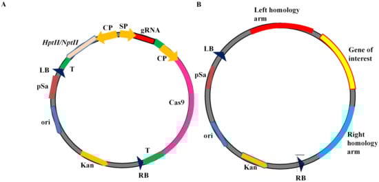| pHSN401 | 12.7 | Kan | pSA, pUC | Hyg | Cas9 regulated under CaMV35; gRNA under AtU6 | [37] |