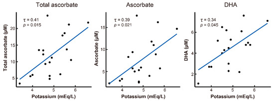 Scatterplots of the plasma potassium levels and total ascorbate, ascorbate, and dehydroascorbic acid (DHA) levels. The dots indicate the expressed data of individual patients on hemodialysis (n = 19). The blue lines are regression lines. The Kendall’s rank correlation coefficients are shown in Table 2.