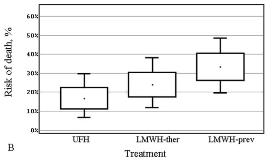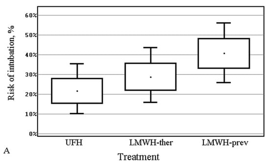 During the 28-day observation period, the intubation rates were 17, 10, and 9 patients while the mortality rates were 14, 10, and 7 for LMWH-prev, LMWH-ther, and UFH groups, respectively (Figure 1). None of the patients were intubated at the time of admission to the intensive care unit (ICU) and before the initiation of heparin therapy. Figure 1 shows the risk of intubation (1A) and death (1B). There were no statistically significant differences between the groups either for intubation or for death (chi-squared test, p = 0.156, and p = 0.205, respectively). Positive trends in the number of intubations and deaths were observed when comparing UFH therapy to both LMWH therapies. Positive trends were also seen if therapeutic doses of LMWH were compared to LMWH at prophylactic doses.