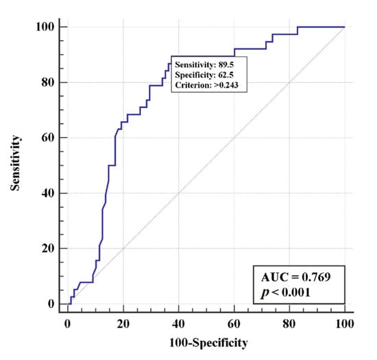 MedCalc® Statistical Software version 19.5.6 (MedCalc Software Ltd., Ostend, Belgium; https://www.medcalc.org; 2020, accessed on 20 May 2021) was used in the analysis. As the law of distribution differed from normal by the Shapiro-Wilk test, the median (Me) and interquartile range (QI–QIII) were calculated to represent quantitative data. Frequency (%) was calculated for qualitative measures. The Kruskal-Wallis test was used to compare quantitative characteristics in the three groups, and subsequent comparisons were made using the Dunn test. To compare qualitative characteristics in more than two groups, a chi-squared test was used, and subsequent comparisons were made using Fisher’s exact test with Bonferroni correction taken into account. Fisher’s exact test was used to compare frequencies between the two groups. To quantify the degree of influence of characteristic factors on the risk of death, we used the method of constructing and analysing logistic regression models. The prognostic quality of the models was assessed using the method of building the receiver operating characteristic curves (ROC curve). The area under the ROC curve (AUC) and its 95% CI were calculated. The effect of the factors was assessed by the value of the odds ratios (OR), for which a 95% CI was calculated. For all statistical tests, the p value < 0.05 was considered significant.