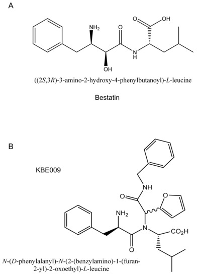 Molecular structure of the metallo-aminopeptidase inhibitors: (A) Bestatin; (B) KBE009. The s-shaped bond shows the stereocenter responsible for the generation of diastereomers.