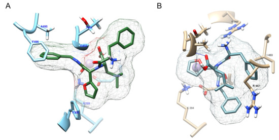 Active site cavity and closed area from TcLAP and hLAP3 showing their interaction with KBE009: (A) model of the interaction pattern between TcLAP and KBE009 showing only amino acids (blue) in contact with the peptidomimetic (green); (B) cartoon of the hLAP3-KBE009 interaction depicting only amino acid residues (beige) in contact with the compound (turquoise). Only one of the two Mn+2 (magenta) is represented. For clarity, only one of the poses of R-KBE009 was represented.