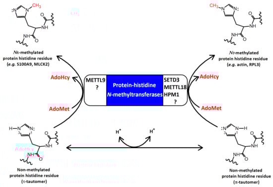 Figure 1. Reactions catalyzed by protein histidine N-methyltransferases. At pH ≈ 7, two neutral tautomers of histidine residues may exist in proteins: the N1-protonated π-tautomer and the N3-protonated τ-tautomer. Data show that different protein histidine methyltransferases catalyze the transfer of a methyl group from S-adenosyl-L-methionine (AdoMet) to specific nitrogen of the imidazole ring. HPM1, SETD3, METTL9, and METTL18 are the only enzymes characterized with this activity so far. AdoHcy—S-adenosyl-L-homocysteine.