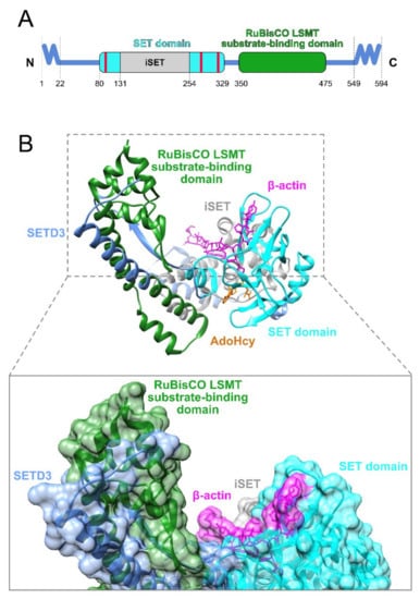 Figure 2. Structure of human SETD3. (A) Domain composition of SETD3. Waved lines correspond to the disordered regions at the N-terminal and C-terminal of the protein. Red bars indicate the localization of amino acid residues at which AdoMet binds to SETD3. Data were retrieved from the NCBI Protein database (accession number: XP_011535533.2, accessed on 30 July 2021). (B) Conformation of human SETD3 (residues 2–502) in complex with the peptide substrate derived from β-actin (residues 66–88) and close up view of the SETD3 substrate binding cleft with molecular surfaces. The image was created in UCSF Chimera 1.15 software utilizing the coordinates deposited in Protein Data Bank file 6ICV [36]. The color scheme of domains is common in Figure 2 and Figure 3.