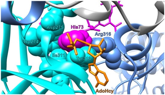 The methylated H73 residue of β-actin fits into a hydrophobic pocket formed by W274, I311, and Y313 of SETD3 [31] (Figure 3). The imidazole ring of H73 is aligned parallel to the aromatic ring of tyrosine 313. Its orientation is determined by two hydrogen bonds—one formed between the N1 and N3 atoms of the imidazole ring and another between the guanidino group of R316 and the carbonyl group in the main chain of N275 [31]. According to a recent study, the substrate binding pocket of SETD3 is charged in a way that corresponds to the surface charge of the actin fragment fitting to it, which also contributes to the proper alignment of the substrate to the enzyme [33].