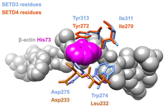 Figure 4. Structural alignment of SETD3 amino acid residues interacting with H73 of β-actin and conserved residues of SETD4. The image was created in UCSF Chimera 1.15 software utilizing the coordinates deposited in Protein Data Bank file 6ICV and the SETD4 structure predicted by AlphaFold [41] using UniProt Q9NVD3 record as an input. Structural alignment was calculated using the MatchMaker tool in UCSF Chimera 1.15 software [36].