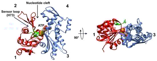 Figure 5. Structures of human β-actin. Ribbon representations of the structures of the actin monomer are shown in different projections. The actin molecule consists of small and large domains (red and blue, respectively), and each one is divided further into two subdomains: 1, 2, and 3, 4, respectively. ATP (or ADP) binds to the cleft between subdomains 2 and 4. The methyl-accepting H73 is located in a sensor loop spanning P70 to N78 (green). This residue is exposed to the surface of the actin monomer and seems to be easily accessible for SETD3. The model was prepared using UCSF Chimera [36] from the Protein Data Bank structures of β-actin (2BTF).