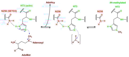 The imidazole ring of the histidine residue contains two nitrogen atoms at different positions: 1 (π) and 3 (τ) (Figure 1). These nitrogen atoms can be protonated, resulting in the formation of an imidazolium cation, and each of them can subsequently release a proton to produce a different imidazole tautomer (Figure 1). Both fully protonated and tautomeric forms of the imidazole side chain are believed to be present at physiological pH ≈ 7 in proteins [51]. Similar to other AdoMet dependent methyltransferases, SETD3 appears to catalyze a conventional SN2 methylation reaction, in which the methyl group of AdoMet is transferred to the deprotonated nitrogen [32] (Figure 6). To facilitate this reaction, the side chain of N256 of the enzyme stabilizes the nitrogen of the substrate H73 residue in the protonated form, whereas the lone electron pair present at the deprotonated attacks the methyl group of AdoMet. This model of SETD3 catalysis is consistent with the findings that (i) the enzyme has an optimum pH of 7 and above for H73 methylation (pKa of 6.5 for histidine imidazole) [31], whereas a K73-containing actin peptide is readily methylated only at a pH above 9.5 (pKa of 10.5 for lysine side chain) [52], and (ii) the substitution of N256 by amino acids that cannot form a hydrogen bond with the protonated Nπ nitrogen results in a reduction or complete loss of SETD3 activity toward H73 residue [48].