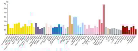Figure 7. SETD3 expression in human tissues. RNA data were obtained from the Human Protein Atlas (HPA; https://www.proteinatlas.org, accessed on 29 July 2021) and show consensus normalized expression levels, determined by combining the data from three transcriptomic datasets (HPA, Genotype-Tissue Expression, and FANTOM5) [53]. Color coding is based on tissue groups, each consisting of tissues with common functional features.