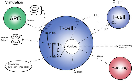 The T cell activation pathway can begin by two general means in vivo: direct interaction with an Antigen-Presenting Cell (APC), and activation via Interleukin-2 (IL-2). Although most μG studies use antigens such as phorbol myristate acetate (PMA), phytohaemagglutinin (PHA), or Concanavalin A (ConA) as stimulation methods, there are a few that review APC interactions via dendritic cells or via the effects of the monocyte/macrophage system on T cells by looking at levels of tumor necrosis factor alpha (TNF-a) [62,71,76,86]. Direct activation requires the presented antigen to form a complex with the naive T cell Receptor (TCR), along with CD28 co-stimulation and cytokine signaling. Alternatively, IL-2 secretion from the initial cell may begin the cascade of auto-proliferation and proliferative signaling of other T cells [115]. This delicate activation pathway may very well be changed by μG and significantly affect immune regulation. Figure 1 displays the T cell “flowchart”, an overall scheme to compare inputs and outputs of T cell activation. Different stimulation methods (inputs) and their targets can be seen on the left side of the image, while activation responses (outputs) are depicted on the right side. The initial T cell is directly activated and begins an amplificatory, proliferative cascade to other T cells through IL-2, among other pro-inflammatory cytokines. This amplification reaction also includes macrophages and other immune cells to complete the immune response.