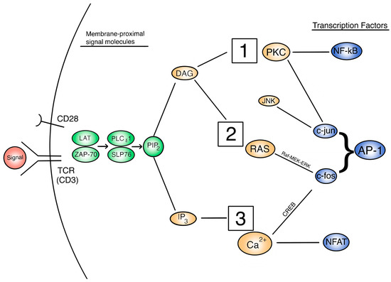 A view of the intracellular T cell activation signal cascade, with signal molecules of interest. 1 = PKC/NF-kB pathway. 2 = Ras/AP-1 pathway. 3 = Calcineurin/NFAT pathway.