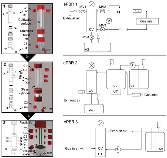 Development steps (D) of the reactor geometry including process flow charts of reactor periphery. (1) ePBR 1 developed by Kuhne et al. [7]. C1 = Inlet for compressed air. C2 = Inlet of aerosol. C3 = Outlet of compressed air and aerosol. C4 = Outlet for recycling medium. (2) Optimized ePBR 2 by Strieth et al. [18]. Two connections (C5 and C6) were added for online monitoring (temperature and humidity). (3) New design with an integrated atomizer unit. Addition of two connections (C7 = Inlet for medium; C4 = Outlet for recycling medium). Process flow charts of the different development steps of the ePBR 1 [7], ePBR 2 [18] and ePBR 3. V1 = Stock vessel for medium. V2 = Nebulizer vessel. V3 = Stock vessel for medium/condensed medium. V4 = Vessel to recycle the condensed medium. UT = Ultrasonic transducer. P = Dosing pump, to pump the medium. CV = Cultivation vessel.