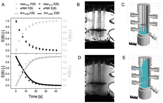 CFD-simulation of aerosol flow through ePBR 3 using an ultrasonic transducer. (A) Experimentally determined RTD and CDF for ePBR 3 (ePBR), calculated RTD and CDF for an ideal stirred reactor (IdealSTR) using the volume of ePBR 3 and simulated RTD and CDF for ePBR 3 (SimePBR). E(θ) = dimensionless residence time distribution function. F(θ) = dimensionless cumulative distribution function. For modelling and visualization, the software GeoDict was used. (B) Aerosol distribution without compression captured in a black and white image using a camera. (C) Simulated aerosol distribution without any volume flow. The particles (cyan) are distributed in the lower third of the ePBR without compressed air. For this reason, the aerosol particles were injected with a slight upward starting movement. (D) Aerosol distribution with 1 L min−1 compressed air after 30 seconds of running time captured in a black and white image using a camera. (E) Simulated aerosol distribution with 1 L min−1 compressed air after 30 seconds of running time.
