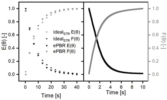 To determine the residence time distribution (RTD) of aerosol particles in the ePBR at a gas volume flow of 1 L min−1 a negative step function was used. Therefore, the tracer (aerosol particles) was pumped into the reactor until the entry concentration coincided with the exit concentration (steady state). At the start time, the flow of aerosol was interrupted. The aerosol density was captured in black and white images using a camera (HCC-1000, VDS Vosskühler GmbH, Osnabrück, Germany, three pictures per second, exposure time 10.8 ms). The histograms (grey scale distribution) of the recorded images were read out using ImageJ [25] and then an average was calculated for each image, which was used as a reference for the concentration of the aerosol particles in the reactor. However, the smallest mean grey value stands for a reactor that contains no aerosol. This value was subtracted from all the images taken and the resulting grey value n was assumed to be the amount of substances c, at time t. Subsequently, for the calculation of the aerosol concentration in the reactor, the amount of the substances was divided by the reactor volume VR, of 0.171 L. However, it is assumed that the standardized tracer concentration (aerosol) can only assume values between one and zero, since c(t) < n0 with n0 = the mean grey value at the time t0 applies all the time. The test time t is replaced by the dimensionless time θt.