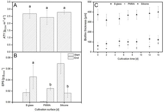 Based on the characteristics of the surfaces and the hydrophilic properties of Nostoc sp., PMMA should be the best substrate of the examined surfaces for the cultivation of Nostoc sp. However, no differences in the ATY achieved could be found on the different substrates (see Figure 4A). Especially on silicone, a lower ATY was expected compared to the other surfaces, due to the low light intensity in the cultivation area and the hydrophobic surface. Presumably the way of inoculation plays an important role as well. The CWW was centrifuged out of the submerged preculture and then applied to the surfaces. Sekar showed that the amount of adherent cells from Nitzschia amphibia (diatoms) is proportional to the cell density, regardless of the wettability of the surface [20]. Preliminary experiments showed that Nostoc sp. actively changes the pH of the medium, which means that the precultures have a pH of nine (data not shown), which also promotes cell adhesion. Accordingly, the conditions for the adhesion of Nostoc sp. on the different surfaces were almost optimal. Furthermore, it can be assumed that the composition of the EPS changed over the cultivation period to improve the adhesion. The synthesis of rhamnolipids from EPS could, for example, increase the surface hydrophobicity of the cells [38] and thereby lead to an improvement in cell adhesion. Pseudomonas aeruginosa produces rhamnolipids in order to increase the surface hydrophobicity and thereby adhere better to hydrophobic surfaces [39,40]. Basically, an increase in EPS production on silicone would be expected in order to increase the surface hydrophobicity of the biofilm. However, the EPS amount decreased on silicone and increased on borosilicate glass and PMMA over the cultivation period (see Figure 4B). Hydrophilic polysaccharides may have been degraded to increase the percentage of hydrophobic polysaccharides. For this purpose, the polysaccharides of the EPS should be analyzed in further experiments. The production of EPS on the hydrophilic surfaces could be explained by the fact that the growth conditions were better, whereby nutrients were stored in the EPS [41]. During the inoculation process the equal distribution of biomass on silicone was difficult. This resulted in a higher biofilm thickness at the beginning of the cultivation compared to the hydrophilic surfaces (see Figure 4C). This was probably due to the hydrophobic surface of the silicone and the hydrophilic EPS from Nostoc sp. The vertical spread of the biofilm on silicone could have been influenced by two factors: (i) the hydrophobic surface of silicone and (ii) pH of the nutrient mist. The pH in the ePBR, without a suitable buffer or a pH control, drops to pH 6 due to atmospheric CO2 dissolving in the water droplets. As previously described, an acidic pH makes the adhesion of the biofilm difficult [20]. The drop in pH in combination with the hydrophobic surface could have caused the vertical spread of the biofilm. It has now been argued that the pH of the culture at pH 9 facilitates the adhesion of the biofilm. It should be noted here that the aerosol is only added after the biofilm has adhered and therefore has no influence on the primary adhesion, but on the horizontal spreading of the biofilm over the cultivation period. In contrast, an area spread on the hydrophilic surfaces was possible, which led to a vertical and horizontal spread of the biofilm (Figure 4C). This could also explain the high production of EPS on hydrophilic surfaces, which facilitated the adhesion of the biofilm. Potentially, less EPS was produced on borosilicate glass compared to PMMA, because of the better wettability of borosilicate glass.
