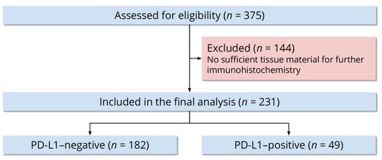 Out of 375 women, 231 (61.6%) had sufficient tissue material for further immunohistochemistry. We included all 231 women in the final analysis (Figure 1). The mean age at definitive surgery was 61 ± 11 years. Of all women, 139 (60.2%) were 65 years or younger and 92 (39.8%) were older than 65 years. Two hundred women (86.6%) were nationals of Jordan and 31 (13.4%) were nationals of other countries in the Middle East and North Africa. Forty-five women (19.5%) reported a family history of cancer in a first-degree relative, 10 (4.3%) reported a family history of cancer in a second-degree relative, 133 (57.6%) reported no family history of cancer, and 43 (18.6%) were unable to provide a family history.