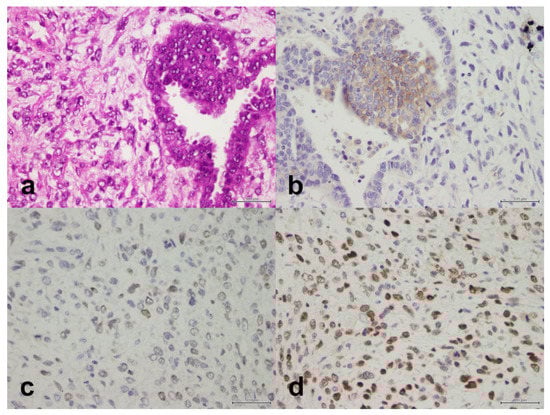 Figure 2. Carcinosarcoma composed of a component of high-grade serous carcinoma and a component of malignant mesenchymal stroma. (a) H&E, X40. (b) PD-L1 is positive in the epithelial component only, X40. (c) PMS2 is retained, X40. (d) MSH6 is retained, X40. Scale bar: 500 μm.