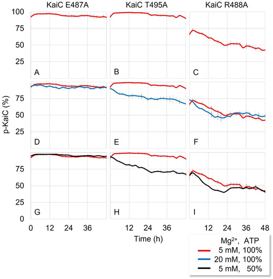 KaiC also had autophosphatase, in addition to autokinase, activity. We previously reported that Mg2+ concentration is a crucial factor for regulating autokinase and autophosphatase activity [14]. In the low or high concentration of Mg2+, KaiC phosphorylates or dephosphorylates respectively even without KaiA and KaiB. However, the excess amount of Mg2+ did not change the phosphorylation state of KaiC-WT (Figure S5). To observe the Mg2+ effect on the phosphorylation state of KaiCE487A, KaiCR488A, and KaiCT495A we added 20 mM Mg2+ (four times higher than the regular concentration) to the reaction mixture. Because its high concentration induced the dephosphorylation of KaiC [14], we expected that Mg2+ would attenuate the kinase activity of the hyperphosphorylated KaiC mutants (KaiCE487A and KaiCT495A) and lead to some degree of dephosphorylation. The effect was not observed for KaiCE487A with 20 mM Mg2+ (Figure 1D). However, KaiCT495A showed dephosphorylation in the beginning and for 48 h remained at ~75% phosphorylation (Figure 1E), which is ~20% lower than that of the regular condition (5 mM Mg2+). In the case of KaiCR488A, dephosphorylation was slightly enhanced by higher Mg2+ at the beginning but stopped at the same level (~50% phosphorylation) after 12 h (Figure 1F), in a manner similar to that of the regular condition (5 mM Mg2+).