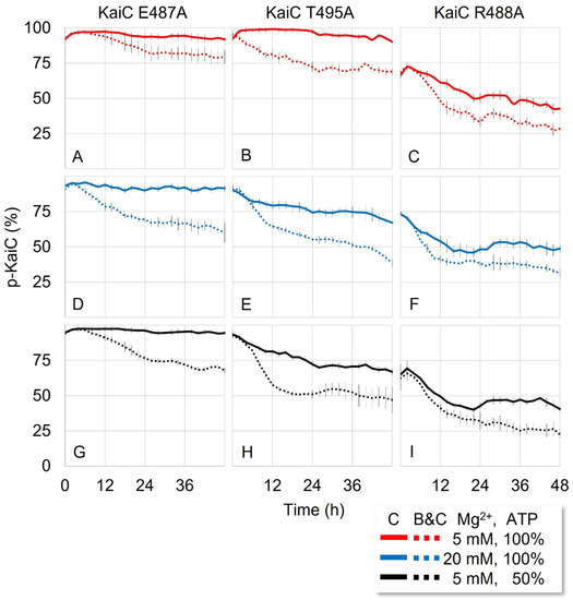 The autokinase activity of KaiC is regulated by the conformation of its A-loop [13]. In the hexameric KaiC, the buried conformation of the A-loop is stabilized by forming inter- and intra-subunit H-bonds, and breaking these interactions enhances the chance to stay exposed [21,22]. This dynamic conformational equilibrium affects the Mg2+ binding in the active sites, resulting in the regulation of the autophosphorylation or autodephosphorylation of KaiC [14]. To observe the H-bonding effect on the KaiC phosphorylation, we analyzed the crystal structure of KaiC (PDBID:1TF7) [23] and selected three putative H-bond forming residues (E487, R488, and T495) on the A-loop for mutation studies (Figure S2). By replacing the original residues to alanine, the H-bonds may be broken in the hexameric KaiC. With the three KaiC mutants—KaiC-E487A, KaiC-R488A and KaiC-T495A (hereafter KaiCE487A, KaiCR488A, and KaiCT495A), respectively—reaction mixtures were reconstituted by following the established in vitro protocol to monitor the phosphorylation states [18]. In the absence of KaiA and KaiB, KaiC–wild type (WT) is known to dephosphorylate [13]. For our KaiC mutants, KaiCE487A (Figure 1A) and KaiCT495A (Figure 1B) started phosphorylation at the beginning of the reaction and remained hyperphosphorylated (>95% phosphorylation) for two days. However, KaiCR488A (Figure 1C) underwent phosphorylation for the first 2 h (although the change is not significant) and slowly dephosphorylated for 12 h until it reached ~50% phosphorylation.