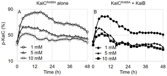 The phosphorylation profile of KaiCR488A was the most intriguing because of its balance between spontaneous phosphorylation and dephosphorylation: remaining phosphorylated for the first 2 h and reaching a steady-state, mildly elevated (~50%) level (Figure 1C). It seems to have the characteristic of a damped oscillator for the KaiCE488A alone reaction. We previously reported that changing the Mg2+ concentration in the reaction mixture modulated the phosphorylation and dephosphorylation of KaiC [14]. It seemed that if we decreased the Mg2+ concentration, we would have observed a higher (or longer) phosphorylation state for the KaiCR488A alone reaction. To test the Mg2+ effect on the phosphorylation of KaiCR488A, we monitored the phosphorylation states in different Mg2+ concentrations in the absence or presence of KaiB. The unusual balance of KaiCR488A between the two antagonistic reactions gave it a unique phosphorylation pattern. At low Mg2+ concentration (1 mM), it distinctively showed kinase activity for 12 h and underwent dephosphorylation afterwards in the KaiCR488A-alone reaction mixture (Figure 3A). When KaiB was present in the reaction mixture, dephosphorylation started earlier than when it was absent (Figure 3B). This abnormal behavior could have come from the flexibility change on the CII domain of KaiC throughout the phosphorylation state [27]. As hypophosphorylated KaiC became fully phosphorylated, the CII domain rigidified, and the A-loop’s dynamic equilibrium shifted from the exposed to the buried conformation (Figure S8). Therefore, KaiCR488A autophosphorylated initially (phosphorylation phase) because the A-loop was exposed in the flexible CII domain. As KaiC gradually became fully phosphorylated, the CII domain rigidified and the A-loop preferred the buried conformation, eventually inducing dephosphorylation (Figure S9).