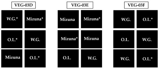 Veggie technical demonstrations on ISS (VEG-03D, VEG-03E, and VEG-03F) showing the pillow and plant layout for each. The ‘*’ indicates pillows returned from ISS for analysis. ‘OL’ is ‘Outredgeous’ red romaine lettuce; ‘WG’ is ‘Waldmann’s Green’ leaf lettuce; ‘Mizuna’ is mizuna mustard greens.