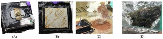 Veggie pillow after return from ISS; (A) top and (B) bottom, (C) root and arcillite substrate sample collection, (D) frozen leaf tissue sample.