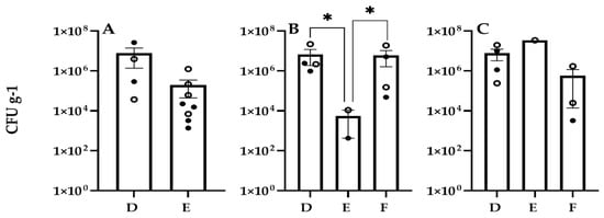 Aerobic plate counts (APC) of bacteria on leaves from Veg-03D, E, and F harvests of the three leafy greens were in the range of 4.3 × 102 (red romaine in VEG-03E) to 3.5 × 107 colony-forming units (CFU) per gram (g) of leaf tissue. Average counts on mizuna leaves from both harvests grown in VEG-03D and E were not significantly different from each other, ranging from 1.4 × 103 to 2.6 × 107 CFU/g. The average counts on green leaf lettuce across experiments D, E, and F were 7.9 × 106, 3.5 × 107, and 5.9 × 105 CFU/g, respectively. Only one harvest was completed on the green leaf lettuce plant from E. Red romaine lettuce grown in VEG-03E had lower counts than those harvested from D and F (p ≤ 0.05). Average bacterial counts from red romaine lettuce leaves from D, E, and F were 6.9 × 106, 5.7 × 103, and 6.1 × 106 CFU/g, respectively (Figure 4).