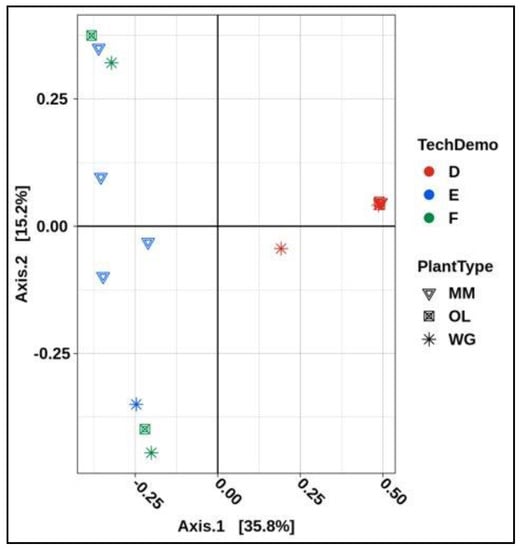 PCoA plot represents the plant leaf tissue returned from VEG-03D, E, and F on the ISS. Plant type MM is mizuna mustard, OL is ‘Outredgeous’ red romaine lettuce and WG is ‘Waldmann’s Green’ leaf lettuce.