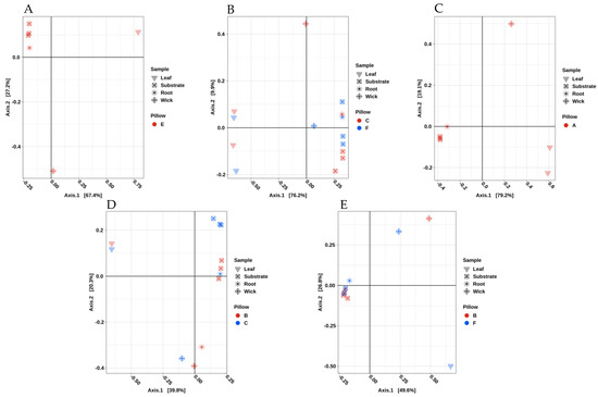PCoA plots represent the plant and pillow components for VEG-03D, E and F tech demonstrations performed on ISS. (A) is VEG-03D mizuna mustard, (B) is red romaine lettuce, (C) is green lettuce, (D) is VEG-03E mizuna mustard and (E) is VEG-03F red romaine lettuce.