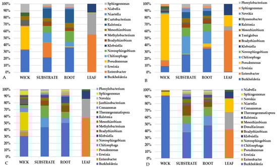 VEG-03D technical demonstration. The top 15–17 genera for the Veggie pillows and corresponding plants as determined by 16S rRNA gene sequencing. (A) is Mizuna mustard; (B) is green lettuce and (C,D) are red romaine lettuce. Percent is the percent total reads of the top genera.