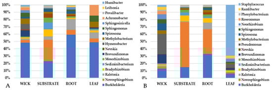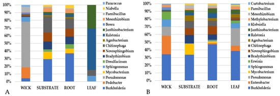 A closer inspection of the top community constituents revealed that variations in the bacterial makeup between pillow sections (wick, substrate, and root) differed from the leaf tissue (Figure 10, Figure 11 and Figure 12). VEG-03D which included analysis of all three leafy green crops grown yielded several bacterial constituents seen in all plant types (Figure 10). These included Burkholderia, Enterobacter, Erwinia and Pseudomonas. However, there were fewer numbers of genera in leaves than in the root, wick, or substrate, which is not unexpected. There were more similar constituents in the wick, substrate, and root with Burkholderia and Novosphingobium identified in each component for all crops (Figure 10, Figure 11 and Figure 12). The wick material appeared to present a higher variation in genera than did root or substrate.