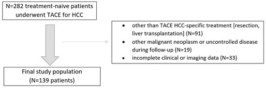 In this retrospective study, we analyzed consecutive treatment-naive patients with HCC confirmed by the imaging criteria by the American Association for the Study of Liver Diseases who underwent initially at least two conventional TACE sessions between 2016 and 2018. The inclusion criteria were as follows: (1) treatment-naïve patients with at least one HCC lesion, (2) patients were not eligible for other than TACE treatment at baseline, (3) patients had Barcelona Clinic Liver Cancer (BCLC) stage A/B disease, (4) patients had Child–Pugh score (CPS) of A or B, (5) patients had an available dynamic contrast-enhanced CT or MRI liver examinations. The exclusion criteria were: (1) patients that did not complete at least two TACE sessions, (2) other than TACE or ablation HCC-specific invasive treatment (e.g., resection, liver transplantation), (3) other malignant neoplasm or uncontrolled disease during follow-up, and (4) incomplete clinical data. The final study population and a summary of the enrollment criteria are shown in Figure 1. The study was approved by the local Institutional Ethical Committee of Human Experimentation and was compliant with the current version of the Helsinki Declaration.