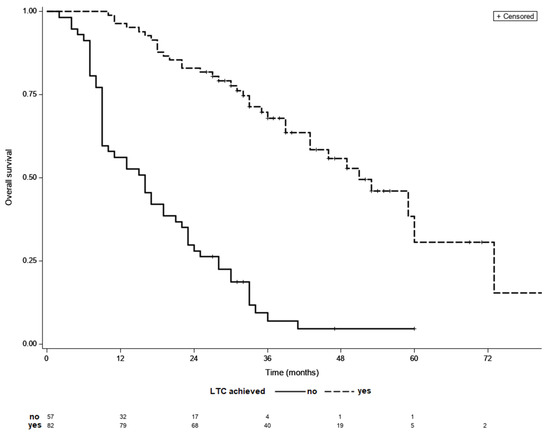 Final analyses included 139 patients, 82 (59%) of whom achieved LTC. Overall, 67 (81%) patients achieved LTC following TACE sessions alone, while 15 (19%) patients required additional ablation treatment following initial TACE sessions. Subjects who achieved LTC had less advanced BCLC stage, had with fewer treated tumor lesions of a smaller dimension, had a lower percentage of patients with baseline alpha-fetoprotein (AFP) concentration below 200 ng/mL and lower baseline AST level (Table 1). Patients that required >3 locoregional sessions to achieve LTC had significantly more advanced BCLC stage than the rest of patients. Overall, 9 patients had infiltrative HCC type, but none of them achieved LTC. The remaining variables did not differ between the analyzed groups. Clinical characteristics of patients that achieved LTC is shown in Table 2. The median follow-up was 29 months while the median OS of the entire cohort was 33 months. The median OS was significantly longer in patients who achieved LTC than in those who did not (51 vs. 16 months, p < 0.001) (Figure 2). The median OS did not differ significantly between groups with different number of locoregional treatment sessions in the entire cohort (p = 0.93).