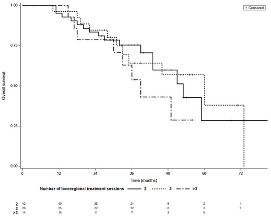 Kaplan–Meier survival curves of patients with different number of locoregional treatment sessions needed to achieve LTC; 2 vs. 3—p = 0.98, 2 vs. >3—p = 0.79, 3 vs. >3—p = 0.95 (log-rank test, Šidák correction).