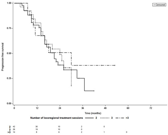 Progression free survival curves of patients with different number of locoregional treatment sessions needed to achieve LTC; LTC; 2 vs. 3—p = 0.99, 2 vs. >3—p = 0.66, 3 vs. >3—p = 0.62 (log-rank test, Šidák correction).
