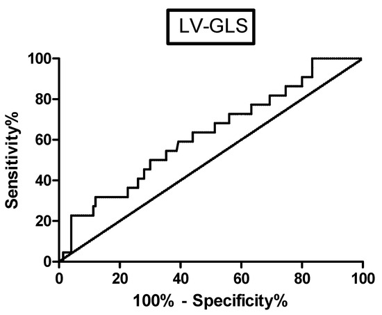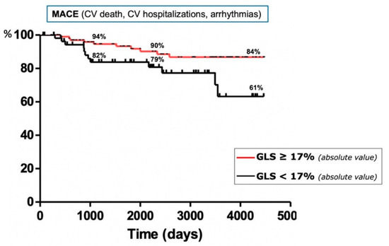 Concerning the echocardiographic parameters, the LV-GLS was significantly lower in patients with MACE (p = 0.0251); a ROC curve assessment confirmed the statistical significance of this finding (AUC 0.6420, p = 0.03177) (Figure 1), reporting a sensitivity of 50% and specificity of 70% for a cut-off value of 17.13 (likelihood ratio of 1.67). The Kaplan–Meier curves confirmed that sarcoidosis patients with GLS < 17.13% were associated with a higher rate of MACE (log-rank test 5.449, p = 0.0196) (Figure 2). No other baseline echocardiographic parameters showed significant differences between patients with or without MACE during the follow-up (Table 2). The univariate Cox analysis showed that an older age, lower serum ACE values and a decreased LV-GLS were significantly associated with MACE incidence in the follow-up (p = 0.002, p = 0.023 and p = 0.017, respectively) (Table A1); however, a multivariate analysis confirmed the statistical significance only for LV-GLS (HR 0.855, 95% CI 0.755–0.968, p = 0.013) (Table A2).